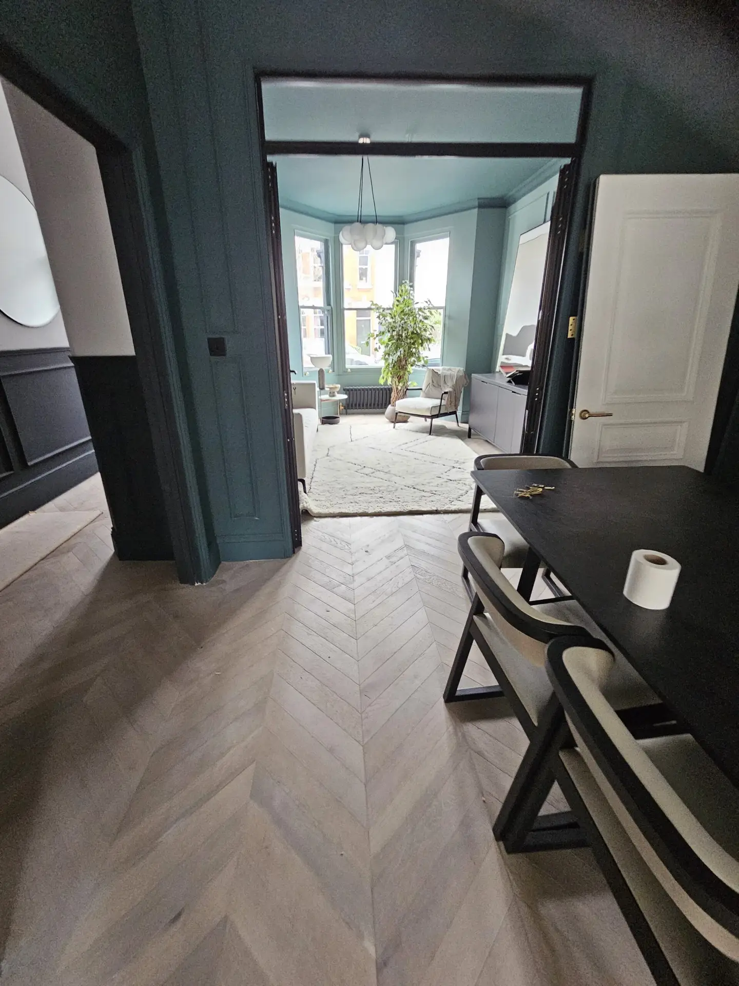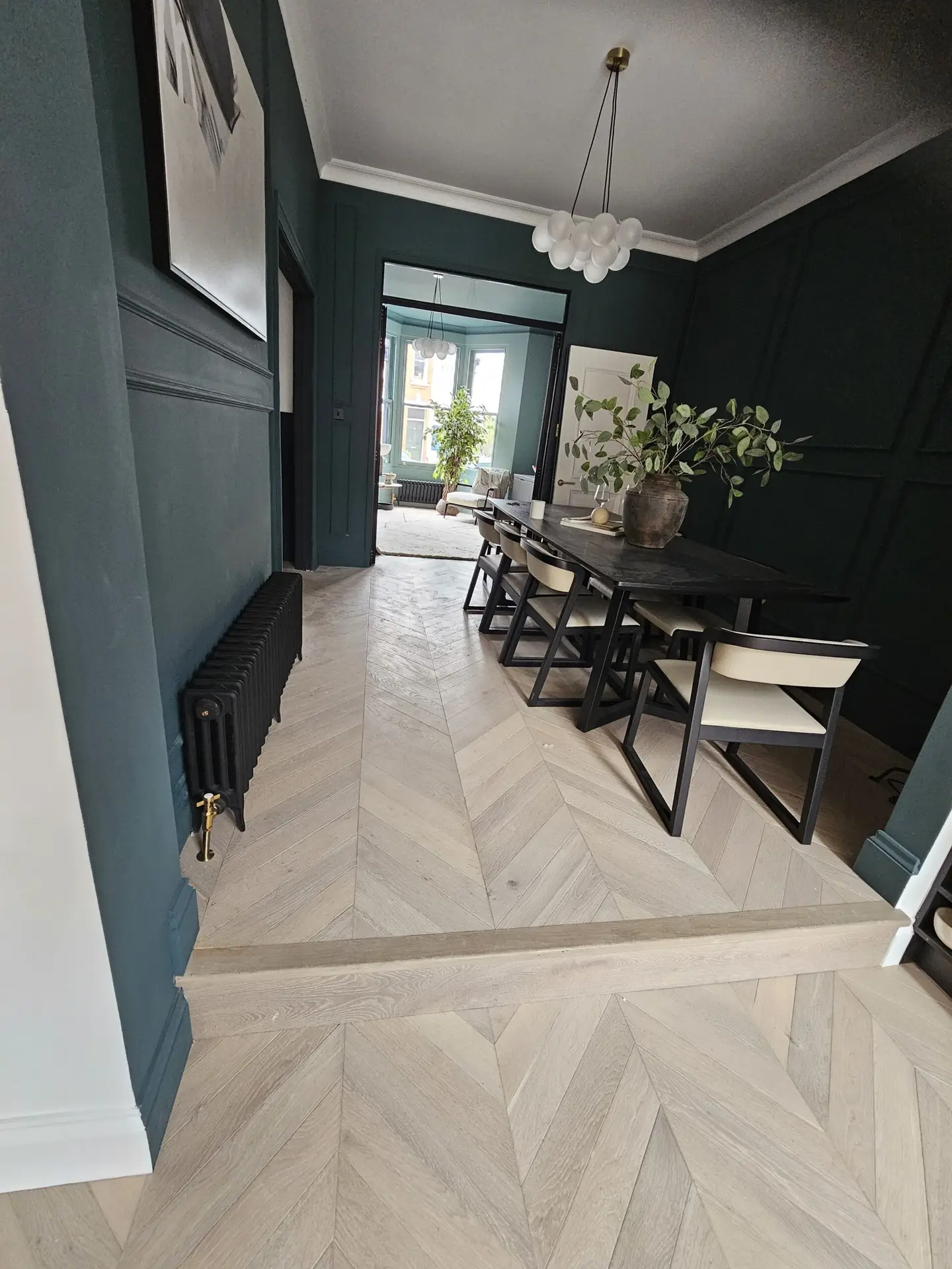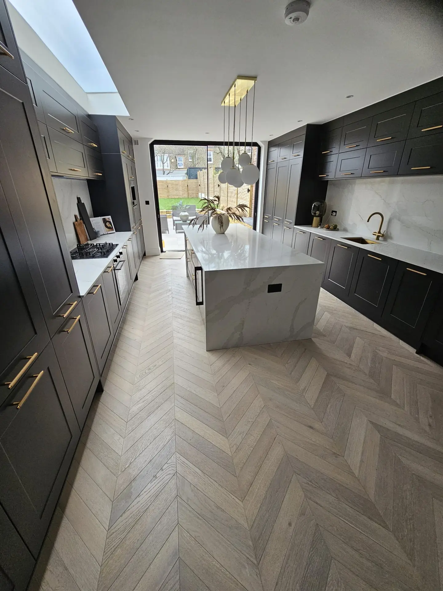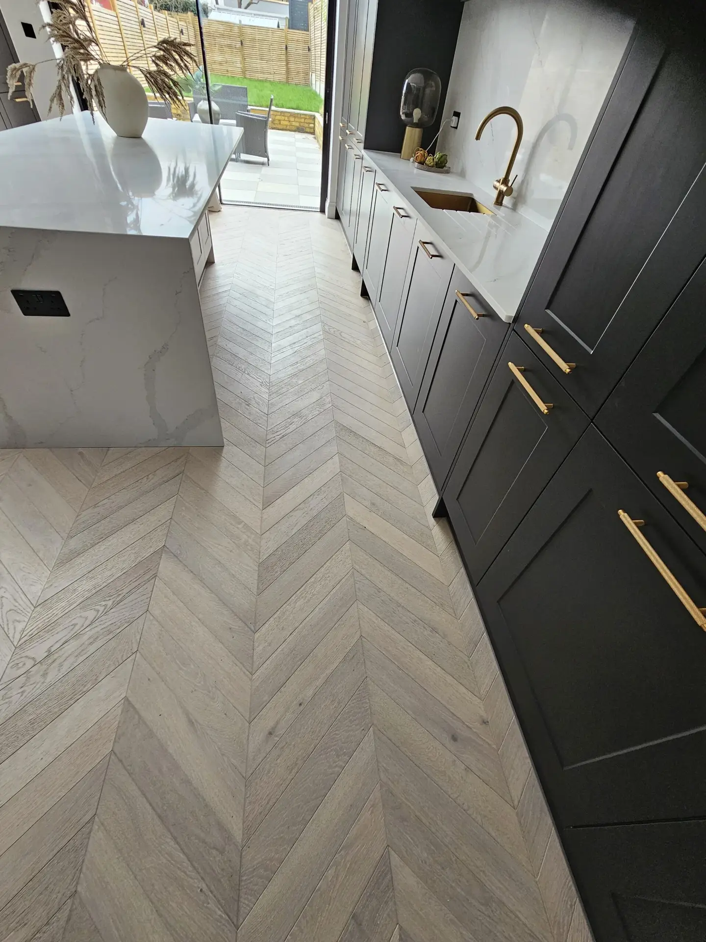 A recent showcase for Trade FloorMasters is a beautifully executed Versaille parquet flooring installation in an elegant Ealing residence. Extending seamlessly from the living area into the kitchen, the patterned wood flooring brings depth, warmth, and sophisticated character to the open-plan layout. Every panel is precisely aligned and finished, creating a stunning continuous flow that complements the modern interior design. This project demonstrates how Trade FloorMasters blends timeless style with meticulous craftsmanship, achieving a result that truly enhances the atmosphere and value of the home.